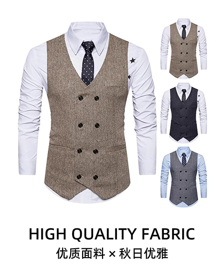 一般適合于復(fù)古穿搭中,在現(xiàn)實中并不常見。相對于單排扣,雙排扣無駁頭的款式會更正式、更嚴謹,尤其是搭配禮服時深受紳士們的喜愛。這個款式的馬甲讓你看上去尤其的有品位,而且它的百搭性也很強。